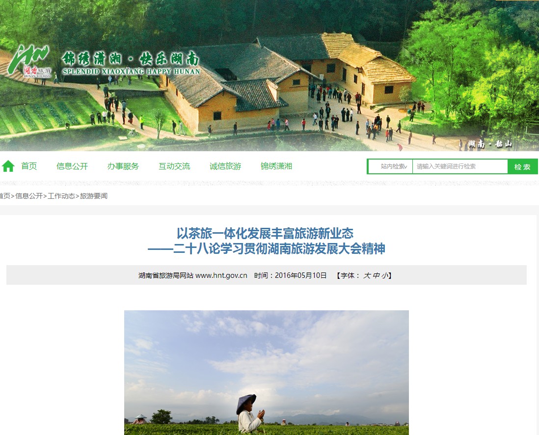 在今年的湖南省旅游产业发展大会上,省委书记徐守盛明确提出要大力推进“旅游+”、积极培育旅游新业态和新产品,推动旅游产业链条向纵深拓展。湖南是我国重点产茶省之一,全省有九十多个县(市)种茶,是名副其实的“茶乡”。茶产业中蕴含的茶景观、茶文化、茶加工、茶产品既是天然的旅游要素,又是茶旅融合发展的优质领域,可以全面实施茶旅一体化发展。