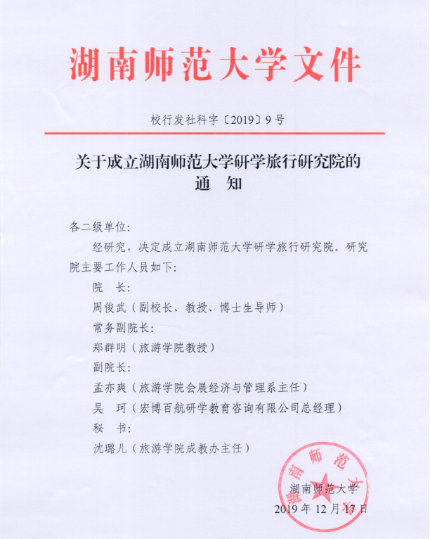 12月17日,学校正式下文成立湖南师范大学研学旅行研究院。副校长周俊武教授担任研究院院长,我院郑群明教授担任常务副院长、我院孟奕爽副教授和宏博百航研学教育咨询有限公司总经理吴珂担任副院长,我院成教办主任沈璐儿担任秘书。