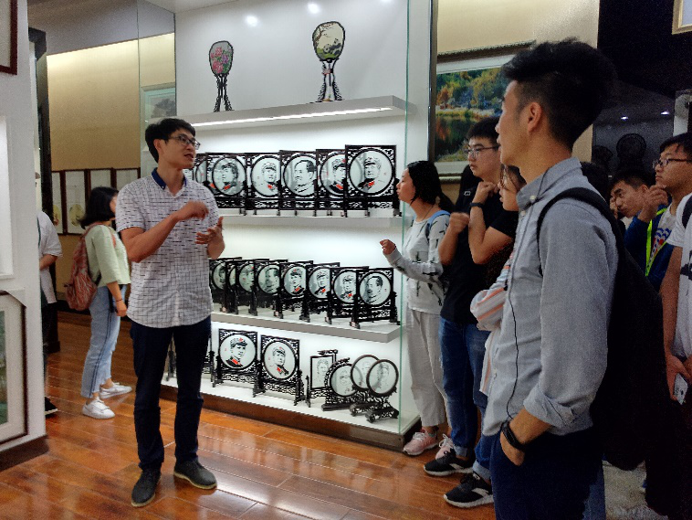 湖南省工艺美术馆韩超、长沙市展览展示服务行业协会秘书长张雄对同学们的到来表示热烈欢迎。在湖南省工艺美术馆的工作人员的带领下,会展班全体同学依次参观了菊花石石刻,彩釉瓷器以及湖南湘绣,并观看了茶艺展示,体验制茶过程。