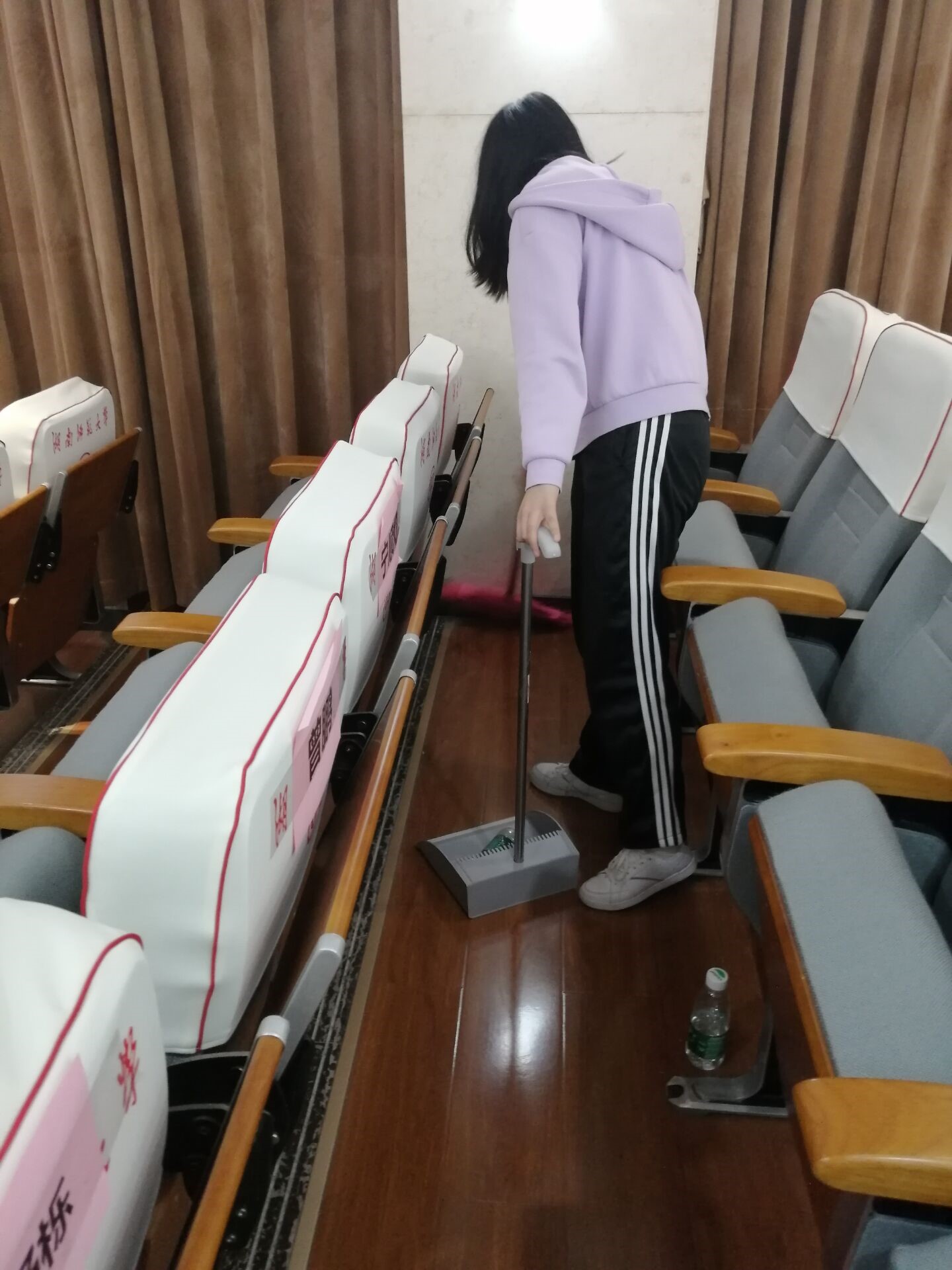 10月17日班级生活委员祖赫敏同学在班级QQ群发布公共区域卫生打扫关于具体地点和时间的通知以及打扫要求,并征集志愿名单。同学们踊跃报名,短期内人数即满。10月18日中午,打扫的同学按时到达打扫地点,经生活委员分工配备工具后即投入到打扫中,活动有序进行。同学们按照要求认真劳动,将会议桌、讲台、过道、会宾室等打扫整洁。